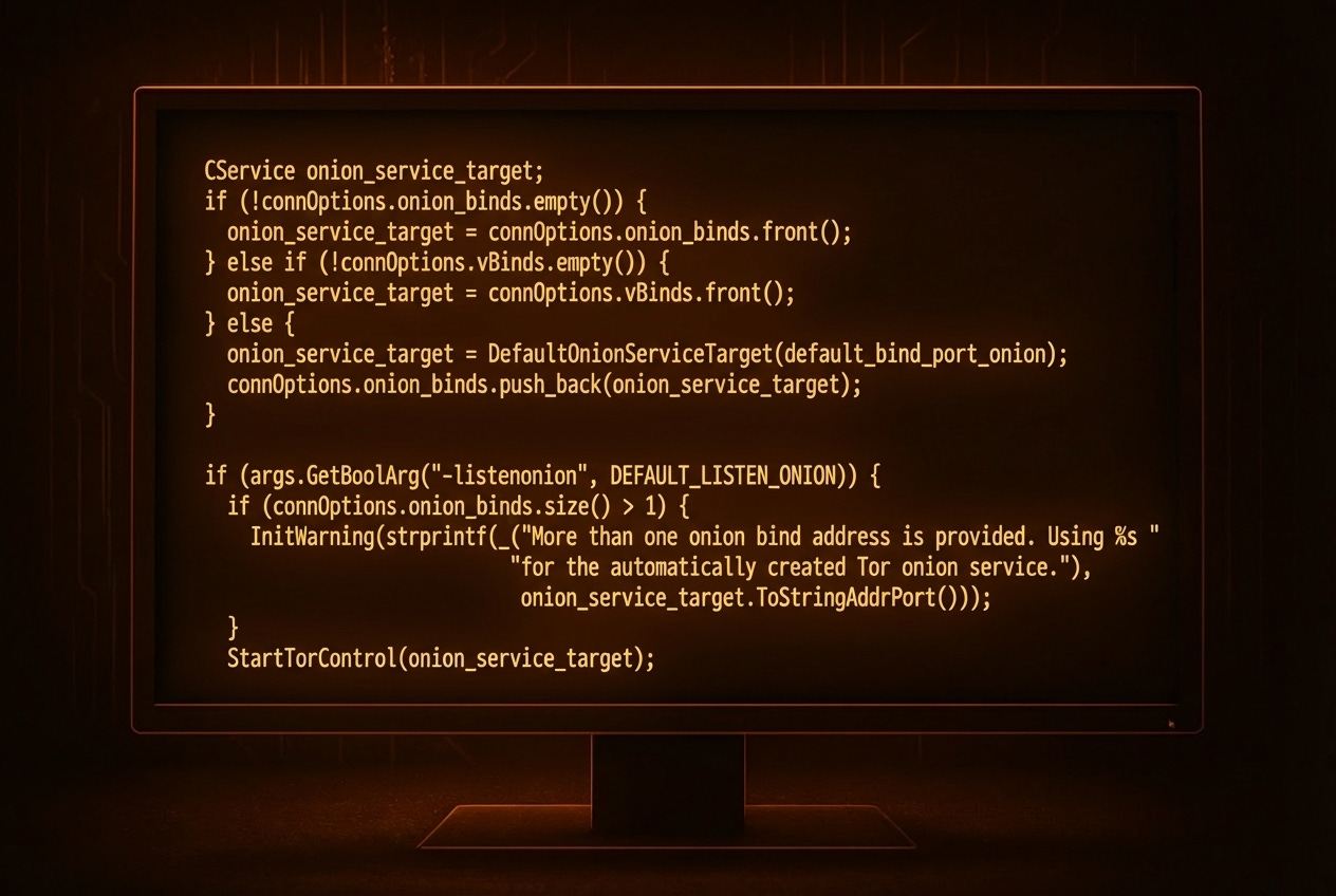 CService onion_service_target;Then, the program tries three different options to choose which local address will receive Tor traffic, by explicitly setting an onion bind address, using the first bind address provided by the user, or setting a default generated address.