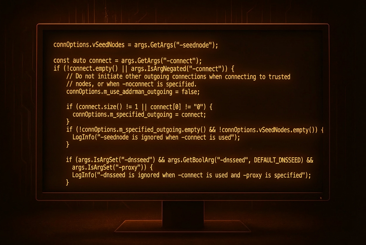 Here, the programs checks if both -connect and -seednode have been defined. If so,-seednode will be ignored, informing the user about this automatic decision. This is done because we explicitly defined which nodes to connect to, so, there is no need for seed nodes to bootstrap peer discovery.